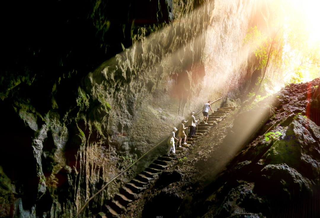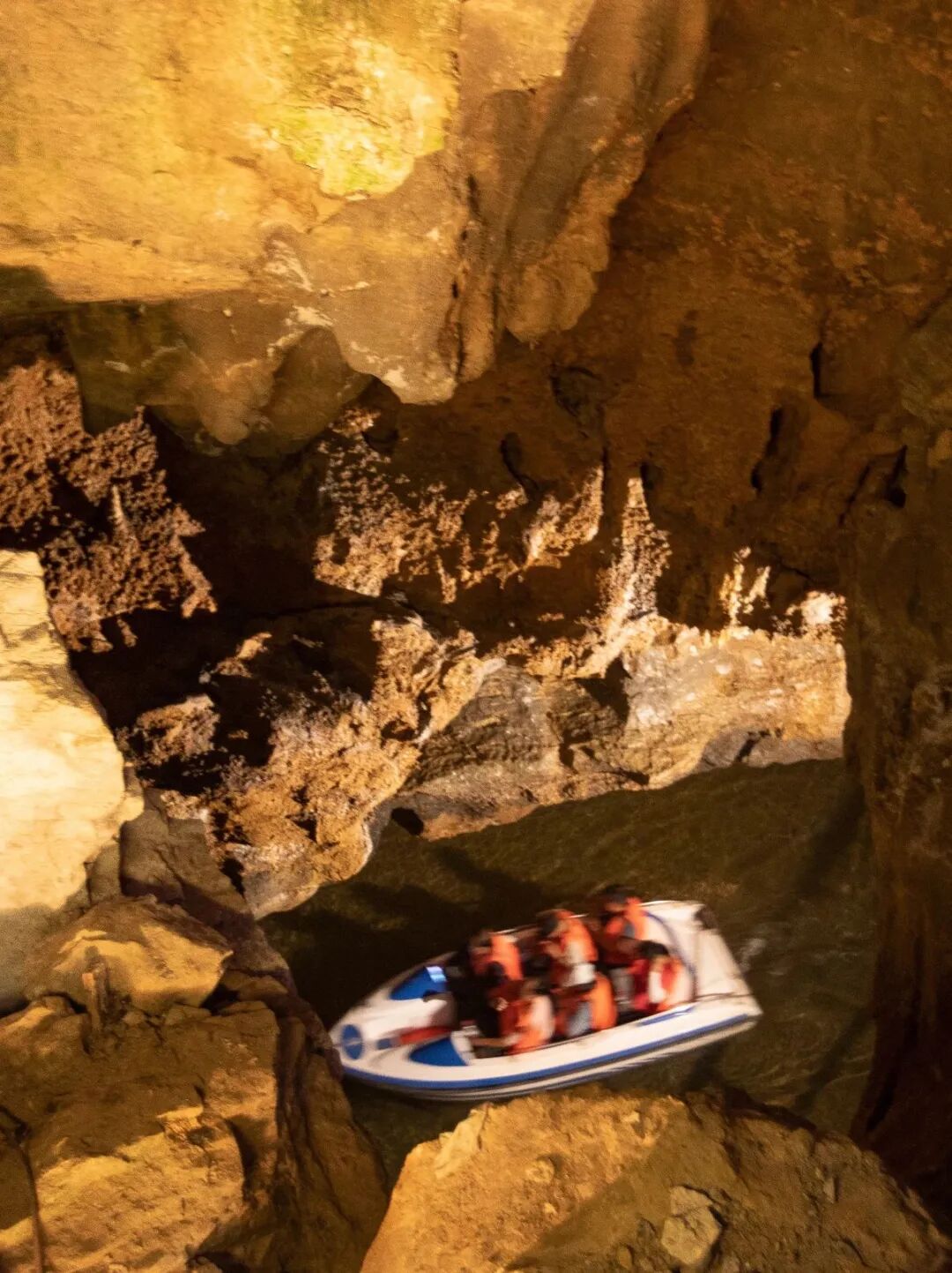 乘一艘小船穿過地下暗河,兩側石幔如垂簾擦著船身掠過。學著小豬妖在懸崖吶喊的姿態,對著幽深的洞道喊一聲。此刻你與它一樣,在荒誕現實中走出了自己的“取經路”。