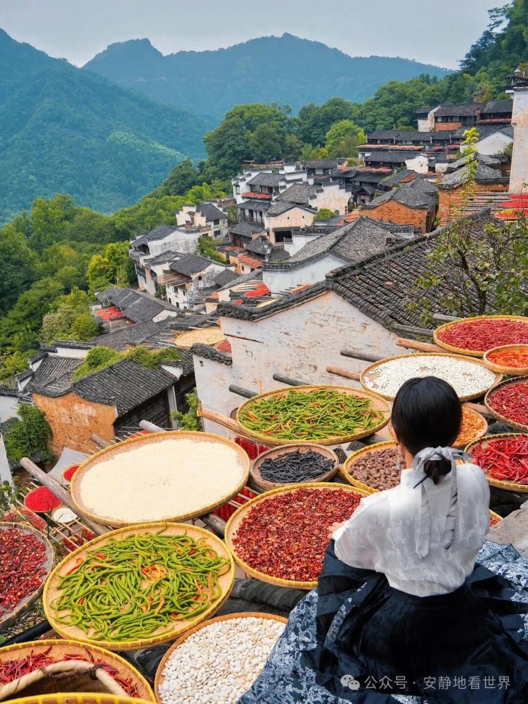 篁嶺是婺源最有煙火氣的古村落,被《中國國家地理》評為“中國最美的鄉(xiāng)村”之一。每家屋頂都晾曬五谷雜糧,黃、紅、綠、褐如調(diào)色盤,盛夏風吹,豐收氣息撲面。 - 山地梯田與花海,視覺沖擊力極強: